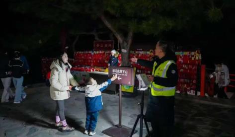 “往年有索道,游客下山快,我们压力小一点。现在索道升级改造,所有游客都得步行下山,这对老人、孩子和体力不好的游客来说,难度大增。”梁磊坦言,“山路不比平路,天黑后视线差、气温低,我们必须把服务做得更细、更靠前。”
